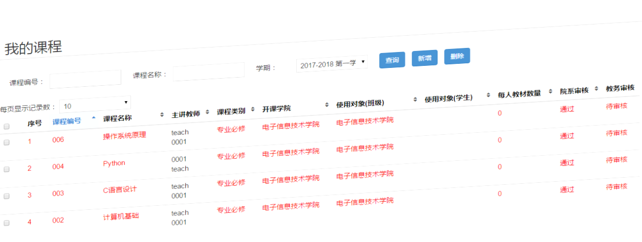 查看我主讲的所有课程,可以新增、修改、删除我的课程。