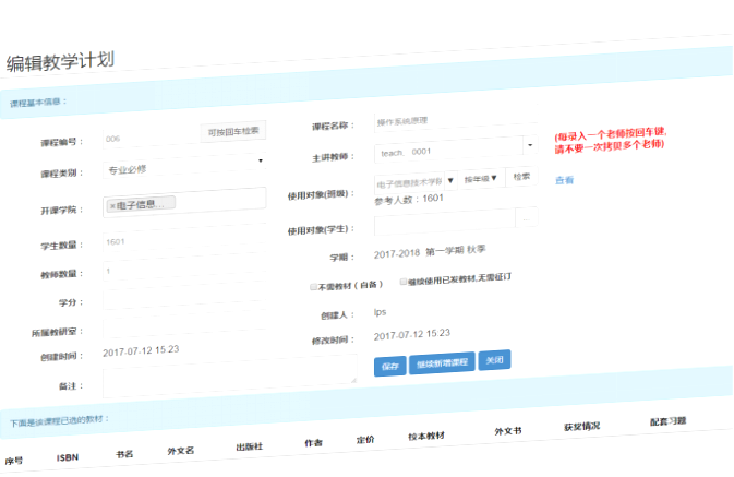 对我主讲的课程进行教材指定、设置上课的班级等课程信息。
