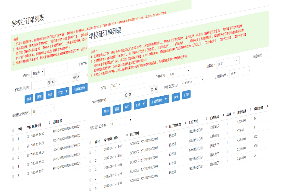 对学校报订的征订单进行处理,汇总统计教材,生成配货单进行出库配送。也可以处理学校的退货单。